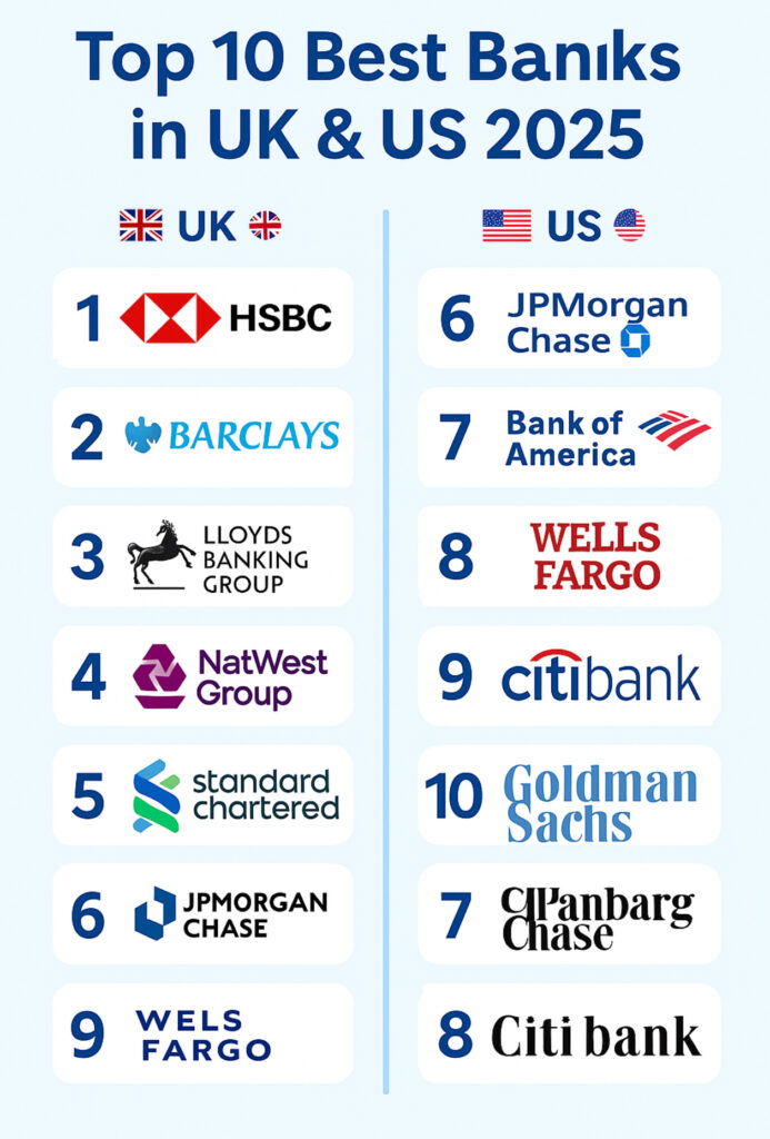 Banking remains the backbone of any economy, and both the United Kingdom (UK) and the United States (US) host some of the world’s most trusted financial institutions. Whether you are looking for savings accounts, loans, or digital banking solutions, choosing the right bank makes all the difference. Below we’ve listed the 10 best banks in the UK and US for 2025, based on reliability, customer service, technology adoption, and financial strength.